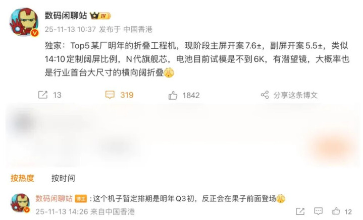 Top5某厂明年的折叠工程机,现阶段主屏开案7.6±,副屏开案5.5±,类似14:10定制阔屏比例,N代旗舰芯,电池目前试模是不到6K,有潜望镜,大概率也是行业首台大尺寸的横向阔折叠