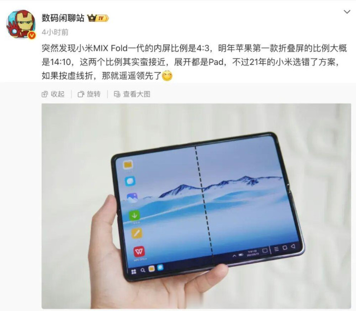 与此同时,以往被多次曝光的苹果折叠屏iPhone也将采用类似的比例设计。同一位博主此前的爆料中也提到了相关的产品细节信息,即“明年苹果第一款折叠屏的比例大概是14:10”。
